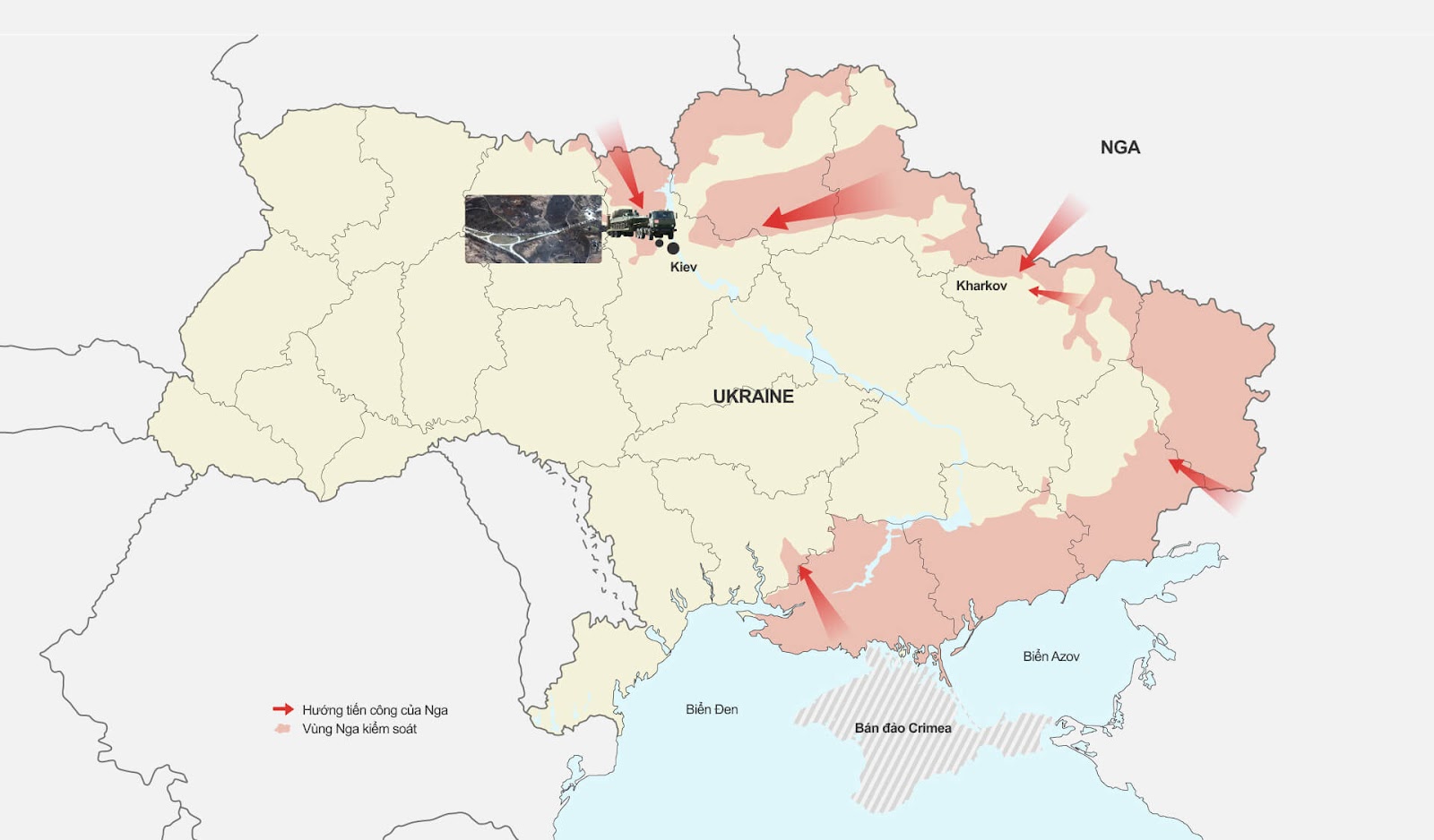 Nga huy động đoàn xe quân sự dài 64 km để tiến vào Kiev nhưng không thành công. Nỗ lực khép gọng kìm ở Kharkov cũng thất bại.